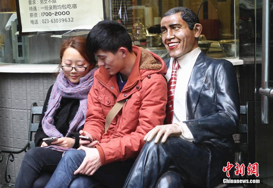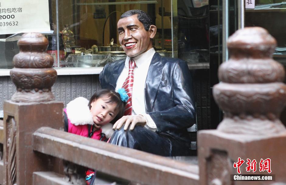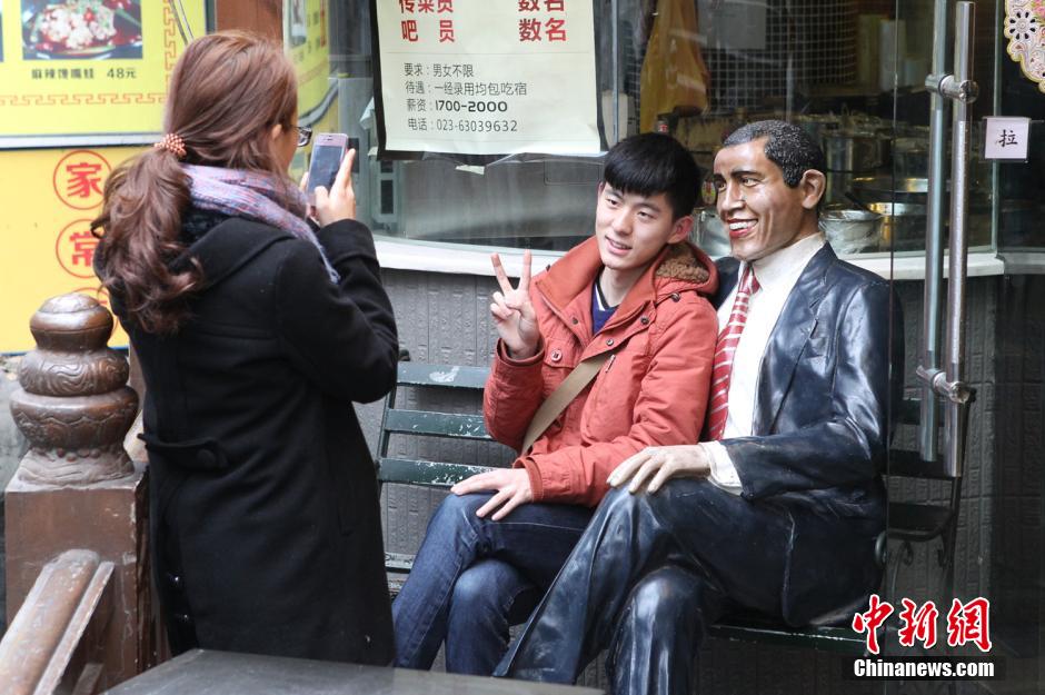 2月8日,重庆渝中区洪崖洞一家餐馆门前摆放美国总统奥巴马仿真塑像吸引游客。周毅 摄