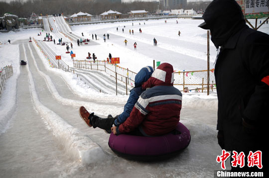 图为民众正在体验冰雪大滑梯。 马新龙 摄