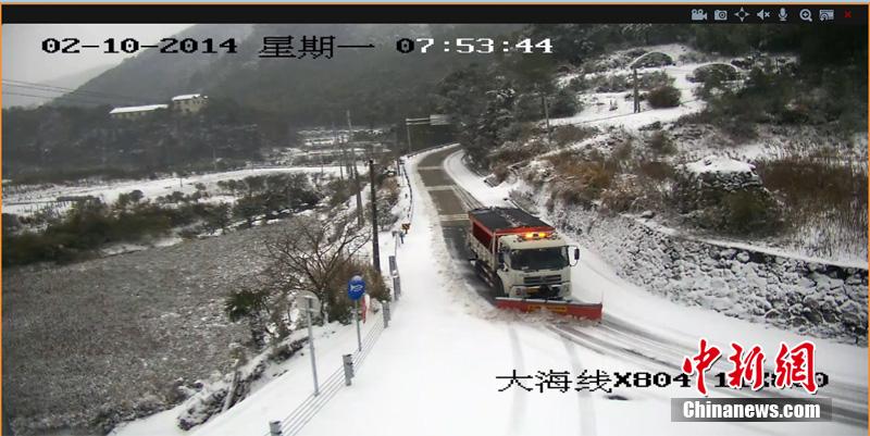 2月9日早晨,浙江省宁波市下起了今冬第一场雪。2月10日,宁波境内多条高速公路因积雪冰冻关闭,扫雪车忙除雪通道。截至2月10日9时50分,甬金主线正常,沿线收费站除溪口西进口限制大客车、危化品车进入,其他正常开通。穿好高速主线及进口恢复正常通行。象山港大桥双向从云龙主线及象山进口开始压道放行。图为宁波北仑通过数字公路抓拍的除雪画面。顾春波 摄