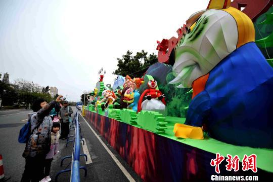2月10日,元宵佳节临近,福州闽江两岸的卡通花灯吸引许多小朋友前来观看、留影。