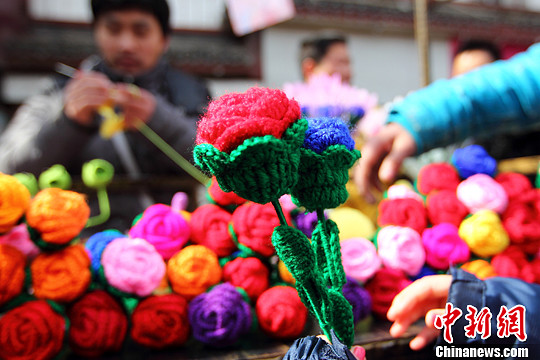 2月10日,南京夫子庙老街上的两位男青年用绒线和钩针编织手工玫瑰花引来围观。中新社发 泱波 摄