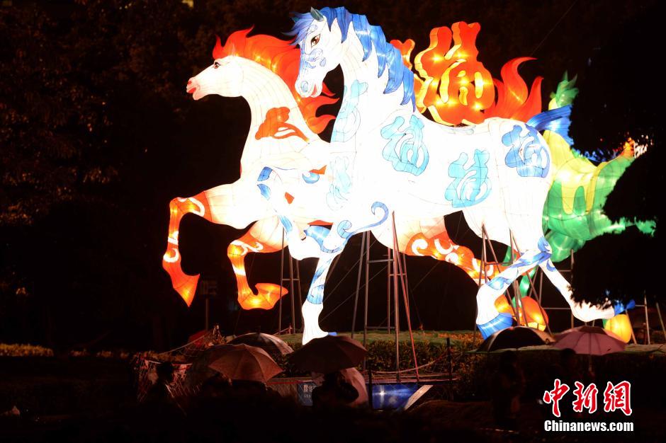2月10日晚,福州闽江公园北园创业广场驮着“福”字的九匹“骏马”在春雨中璀璨亮灯。由福州市委、市政府主办的2014年福州市元宵灯会以“灯耀闽江·幸福福州”为主题,主要选点闽江两岸,展示民俗风采、历史典故、名人风貌、幸福福州等方面的内容,体现福州作为一座历史文化名城的活力与魅力。中新社发 王东明 摄