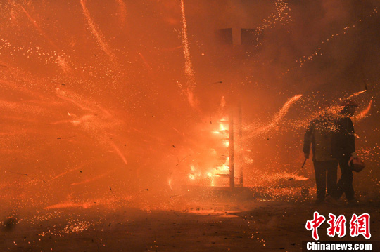2月10日晚,农历正月十一,广西宾阳县迎来一年一度的炮龙节,数万民众在轰轰烈烈的爆竹声中狂欢、燃炮逐龙。图为盐水蜂炮。中新社发 洪坚鹏 摄