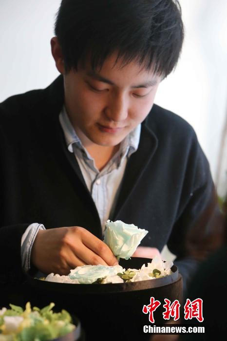 2月11日,在太原一家时尚咖啡店内,太原青年小丁在花艺师夏羽诺的指导下为他十年爱情长跑的女友制作情人节礼物“永生花”盒。小丁告诉记者:希望自己和女友爱情像“永生花”一样永恒不变。张云 摄