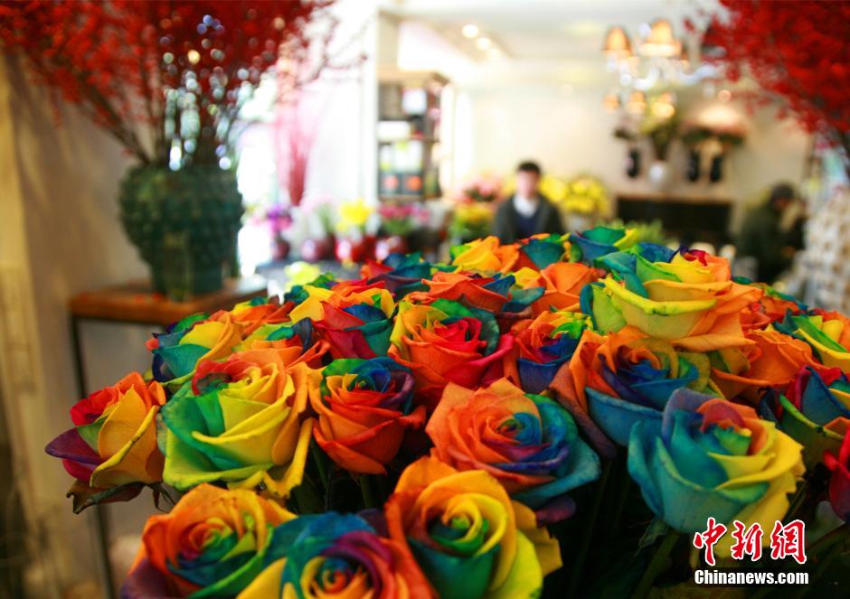 2月11日,浙江杭州中山北路一家高档鲜花门店内的彩虹玫瑰成为今年情人节的明星产品。由于中国鲜花的主产地云南昆明遭遇了几十年罕见的大雪,大面积的花田受冻,产量骤减,杭州市场上玫瑰、百合等节日热卖花卉情人节价格将是平时5倍。中新社发 李晨韵 摄