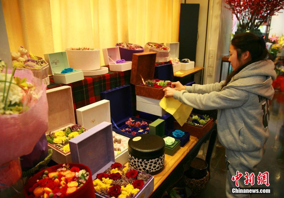 2月11日,浙江杭州中山北路一家高档鲜花门店内,店主正在为即将到来的情人节准备鲜花货源。由于中国鲜花的主产地云南昆明遭遇了几十年罕见的大雪,大面积的花田受冻,产量骤减,杭州市场上玫瑰、百合等节日热卖花卉情人节价格将是平时5倍。中新社发 李晨韵 摄