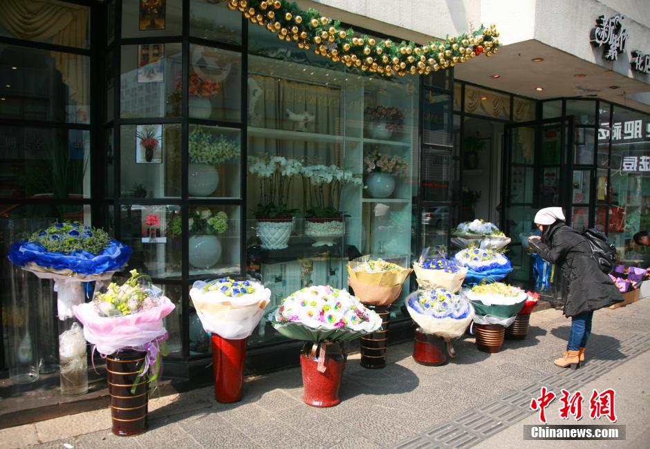 2月11日,浙江杭州中山北路一家高档鲜花门店内,店主向顾客介绍情人节的主打品种。由于中国鲜花的主产地云南昆明遭遇了几十年罕见的大雪,大面积的花田受冻,产量骤减,杭州市场上玫瑰、百合等节日热卖花卉情人节价格将是平时5倍。中新社发 李晨韵 摄
