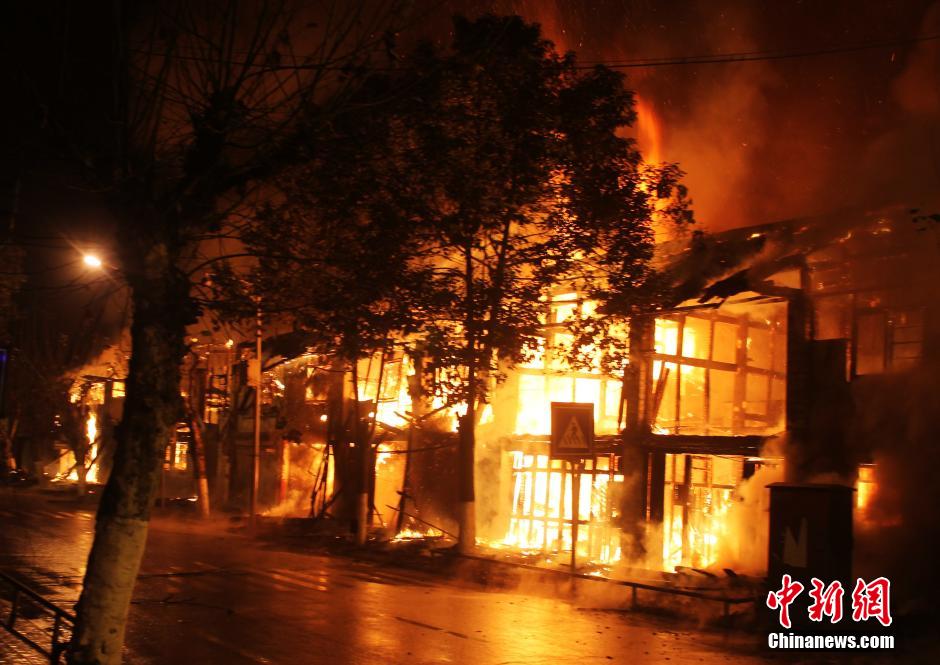2月12日,四川夹江县漹城镇北街一棚户区发生火灾,过火面积达799平方米,造成13户、34人受灾,直接财产损失近30万元。因火灾发生时正值深夜,民众均已入睡,火灾发现较晚。一些住户发现起火后,没有及时拨打报警电话,而是忙于搬运和转移各自财物,加上起火建筑均为砖木结构房屋,火势迅速蔓延,损失惨重。60余消防官兵经过近2个小时的奋战,大火被成功扑灭。目前,火灾发生具体原因以及财产损失正在调查之中。图为消防官兵正在奋力扑灭大火。中新社发 钟欣 摄