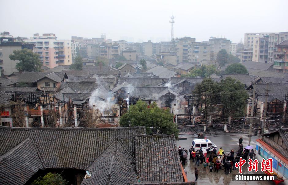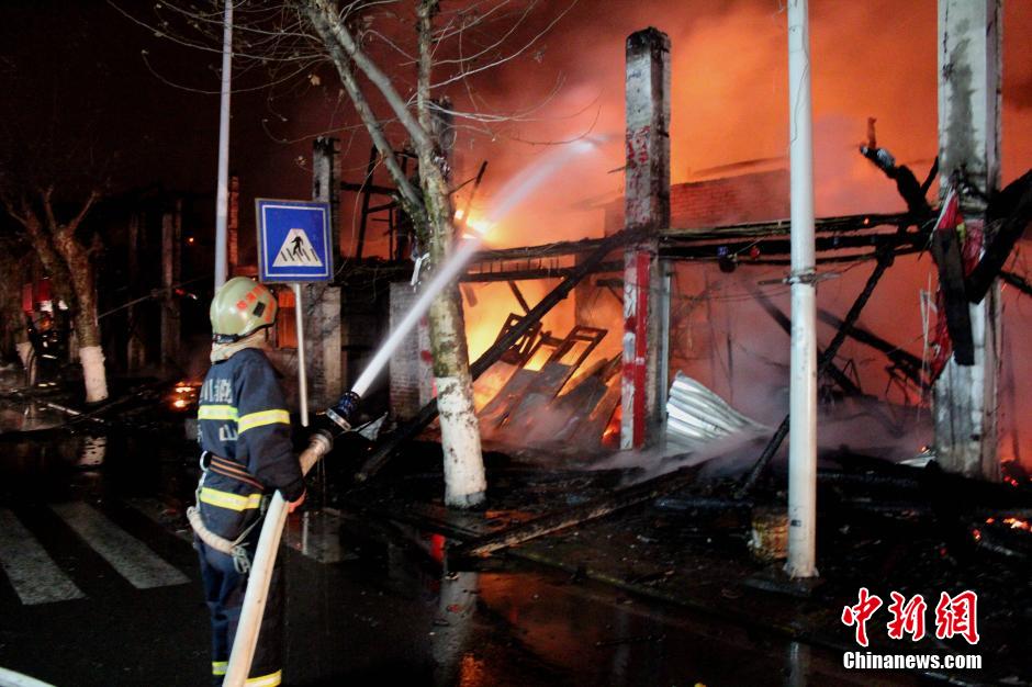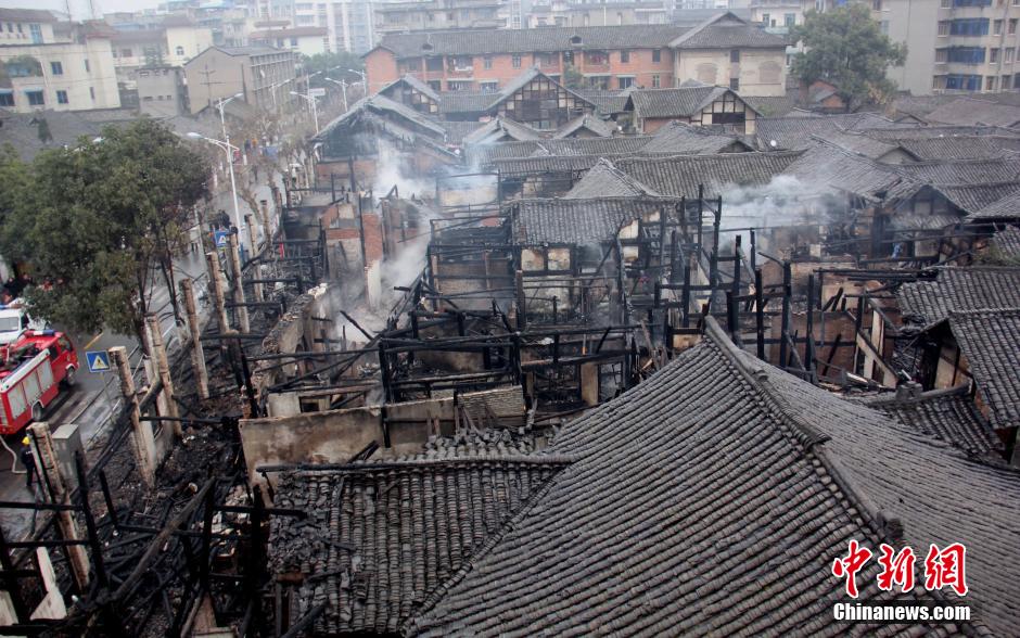 2月12日,四川夹江县漹城镇北街一棚户区发生火灾,过火面积达799平方米,造成13户、34人受灾,直接财产损失近30万元。因火灾发生时正值深夜,民众均已入睡,火灾发现较晚。一些住户发现起火后,没有及时拨打报警电话,而是忙于搬运和转移各自财物,加上起火建筑均为砖木结构房屋,火势迅速蔓延,损失惨重。60余消防官兵经过近2个小时的奋战,大火被成功扑灭。目前,火灾发生具体原因以及财产损失正在调查之中。图为火灾现场10多间民房和商铺被烧毁。中新社发 钟欣 摄