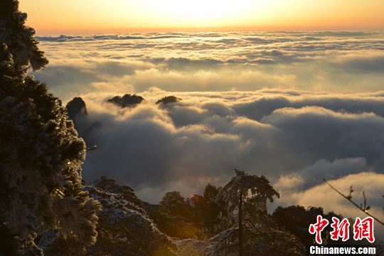从本月9日开始的马年第一场雪将中国著名风景地黄山装扮得分外妖娆。图为近日清晨第一缕阳光下的黄山云海与雪松景色美不胜收。中新社发 郑祚声 摄
