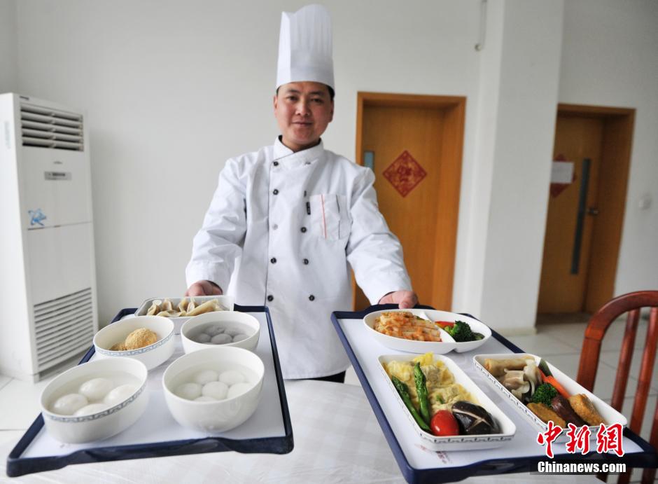 元宵节即将来临,中国南方航空贵州公司配餐部准备了各种口味的汤圆以及“驴打滚”等元宵节食品,让乘客体验空中元宵佳节。据悉,2014年春节期间,该航空公司为乘客配置了富有年味和地域特色的航空餐,包括水饺、蛋夹、黄粑、小米渣、炒年糕等食物。图为厨师长展示富有节日特色的航空餐食。中新社发 李克 摄