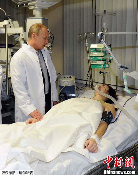 当地时间2014年2月15日,索契,俄罗斯总统普京前往医院探望受伤俄罗斯冬奥滑雪选手玛丽亚-科米斯萨洛娃(Maria Komissarova)。据路透社报道,玛丽亚-科米斯萨洛娃在训练中严重受伤,医生对她进行了六个半小时的脊柱手术。