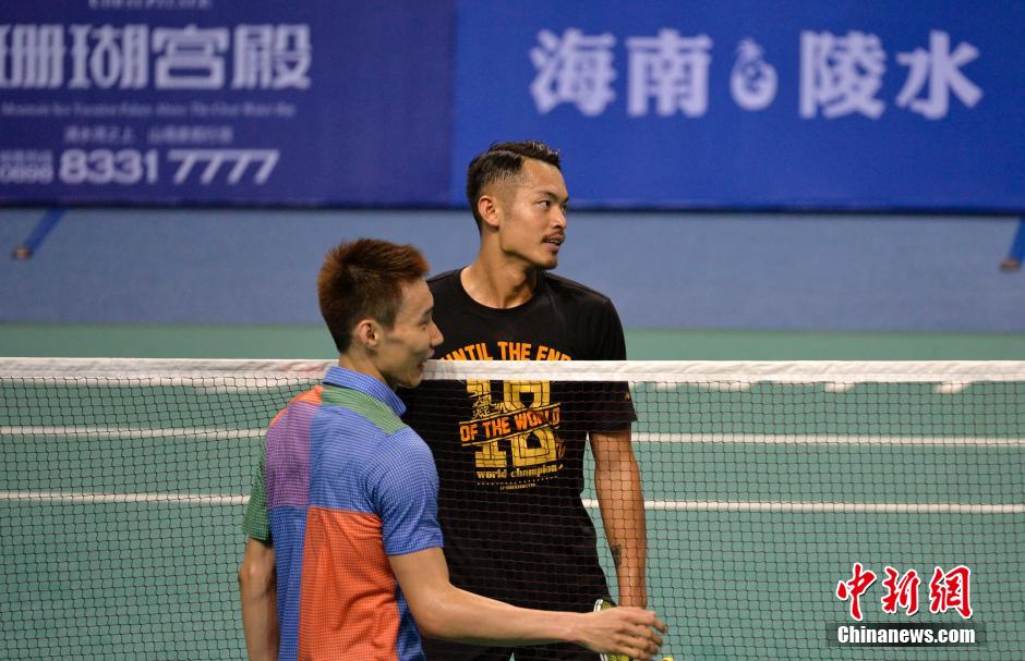 2月16日,2014年中国(陵水)国际羽毛球挑战赛中,林丹与李宗伟历史性地站在球网的同一侧,联袂男双对战2012年奥运男双冠军蔡赟/傅海峰。首局比赛林李以18比21不敌“风云”组合,第二局蔡赟与李宗伟搭档21比19战胜林丹/傅海峰,而这场表演赛也引爆了现场观众的热情。图为林丹正在比赛中。图为林丹与李宗伟。中新社发 骆云飞 摄