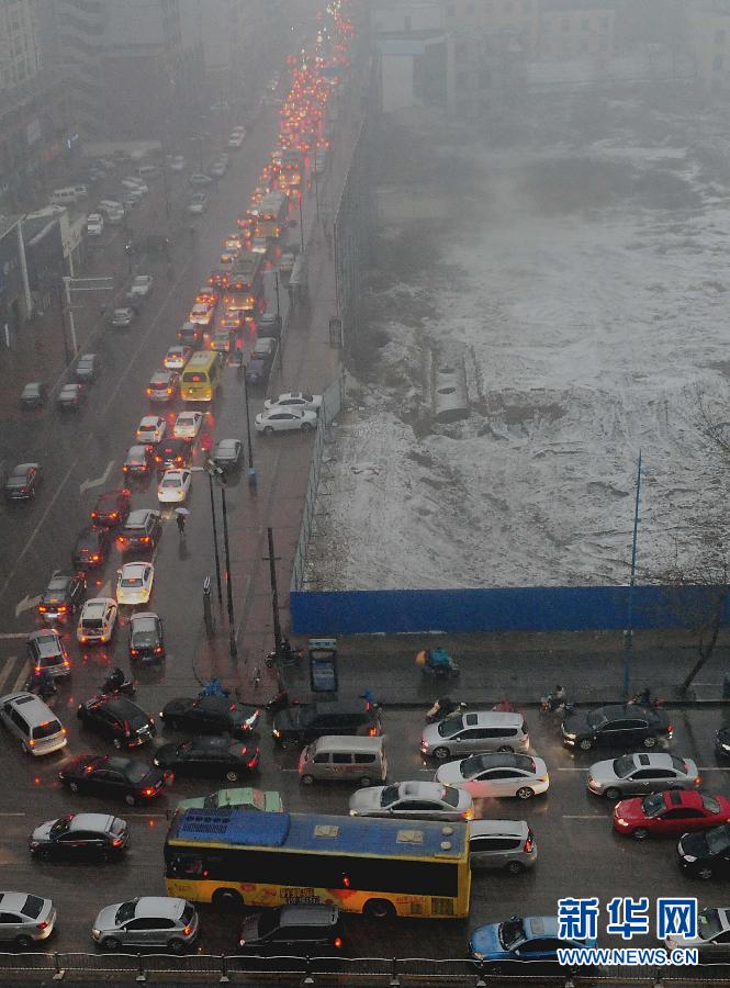 2月17日,郑州市内出现拥堵。当日,郑州市出现中雪转小雪天气,同时有雾霾,市区能见度较低,造成部分路段拥堵。 新华社记者 王颂 摄