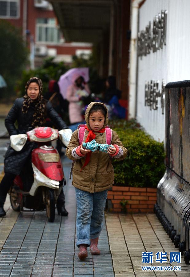 当日,江西南昌市中小学、幼儿园在雨中迎来2014年春季新学期开学第一天。此前,受大风降温雨雪天气影响,南昌市教育局下发紧急通知,将开学时间从2月10日推迟到2月17日,以确保中小学、幼儿园师生出行安全。新华社发(陈子夏摄)