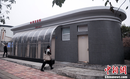 2月17日,以变压器外形修建的公共卫生间亮相重庆主城街头。图为过往市民前来体验“变压器”公厕。中新社发 陈超 摄