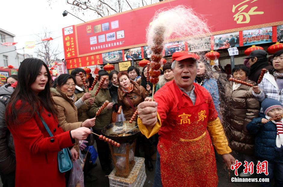 2月17日,青岛海云庵糖球会最后一天,人们在逛会、买糖球、吃糖球。本届糖球会3天,共吸引中外游客180万人次,糖球等各类小吃总交易额为6200万元。海云庵糖球会至今已有500多年的历史,2005年被评为“中国十大民俗节” 之一。中新社发 徐崇德 摄