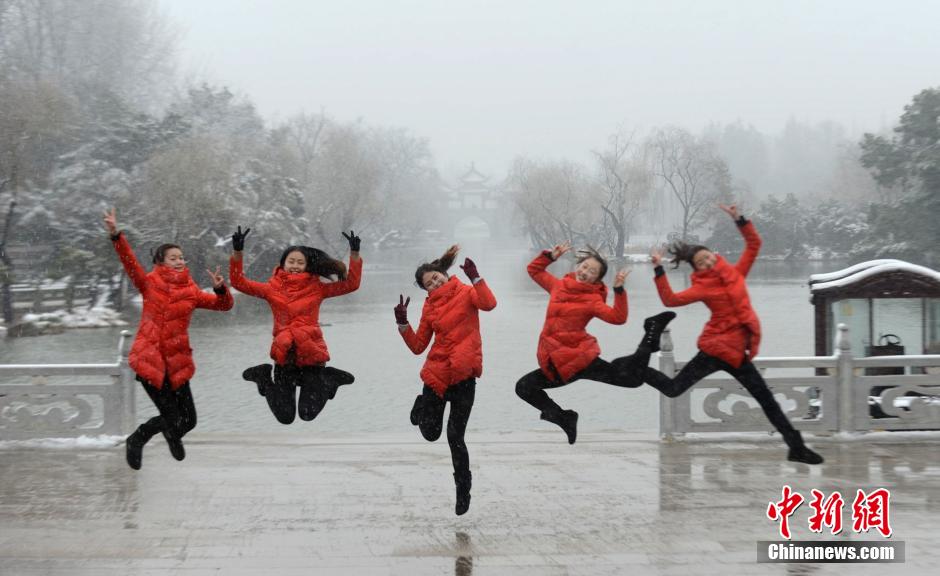 2月18日,江苏扬州大雪纷飞,颇具江南韵味的扬州古典园林瘦西湖景区银装素裹、如诗如画,呈现出一派“北国风光”,吸引了不少市民和游客走出户外,感受春雪带来的快乐。图为几名扬州瘦西湖的导游正在雪中开心的嬉戏。孟德龙 摄