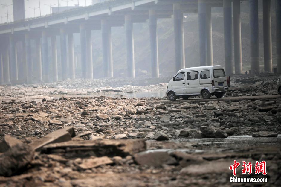 2月19日,嘉陵江重庆段水位持续走低,大面积的河床裸露在外,成为市民娱乐场。河床上有放风筝、喝茶、开卡丁车等娱乐项目,吸引不少市民前来玩耍。图为一市民把车也开到沙滩上了。陈超 摄