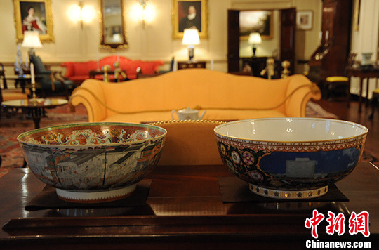 为让外界更多了解美中早期交往,美国国务院19日专程向中国记者展示了所藏珍贵中国瓷器,在这些馆藏作品中,两只“行碗”尤为引人注目。一只制作于18世纪80年代的十三行外景图潘趣酒碗(又称“行碗”),与一只2008年面世的全新“行碗”,并排摆放在美国国务院外交接待室突出位置,被视作“镇馆之宝”之一。在国务院馆藏珍品负责人和历史学家看来,他们不仅代表了中美早期经贸往来的收获,更是中美200多年密切交往的见证者。