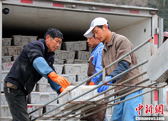 2月24日,浙江台州玉环栈头码头,渔民们正在搬运捕捞来的鱼货。随着海上春汛生产旺季的到来,当地出海捕鱼的渔船捕获了小黄鱼、黄梅童鱼等海鲜产品,出海的渔船普遍获得了50万元左右的收入。中新社发 吴达夫 摄