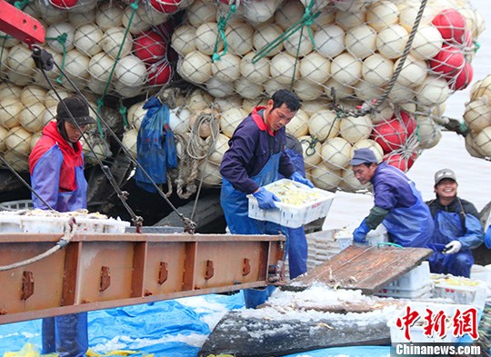2月24日,浙江台州玉环栈头码头,渔民们正在搬运捕捞来的鱼货。随着海上春汛生产旺季的到来,当地出海捕鱼的渔船捕获了小黄鱼、黄梅童鱼等海鲜产品,出海的渔船普遍获得了50万元左右的收入。中新社发 吴达夫 摄