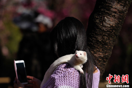 2月25日,一只可爱的宠物貂跟随主人来到昆明圆通山赏花,引得众人啧啧称奇。中新社发 刘冉阳 摄