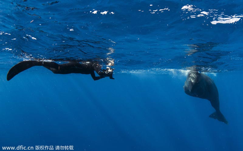 2014年2月27日报道,31岁的美国女潜水员Amanda Cotton,在加勒比地区与抹香鲸一同游泳,并且拍摄了与抹香鲸的“自拍”。