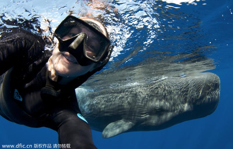 2014年2月27日报道,31岁的美国女潜水员Amanda Cotton,在加勒比地区与抹香鲸一同游泳,并且拍摄了与抹香鲸的“自拍”。