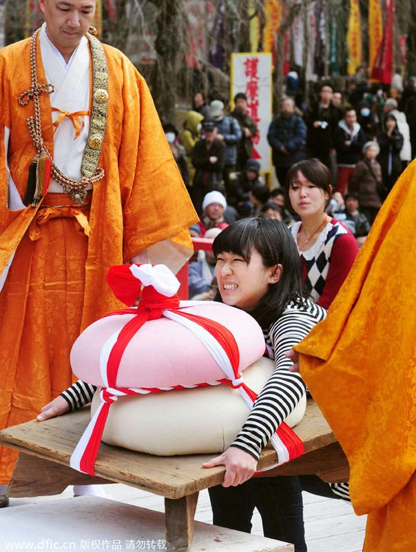 2月23日,京都市伏见区的醍醐寺举办“年糕大力士”比赛以祈祷祛病消灾,北岸美香获得女子组冠军。