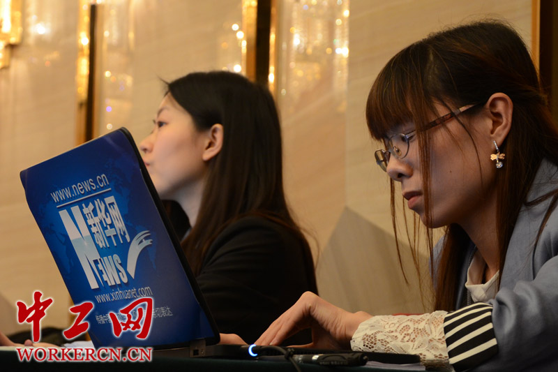 在全国政协十二届二次会议新闻发布会现场,一名记者通过笔记本电脑和无线网络进行图文直播。 (中工网记者 笑语摄)