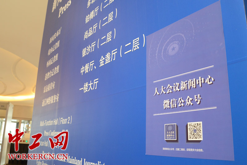 图为全国两会设在梅地亚的新闻中心向媒体公布“人大会议新闻中心微信公众号”。据悉,这是全国两会首次启用微信公共账号平台,用于发布新闻和记者联络。 (中工网记者 笑语摄)