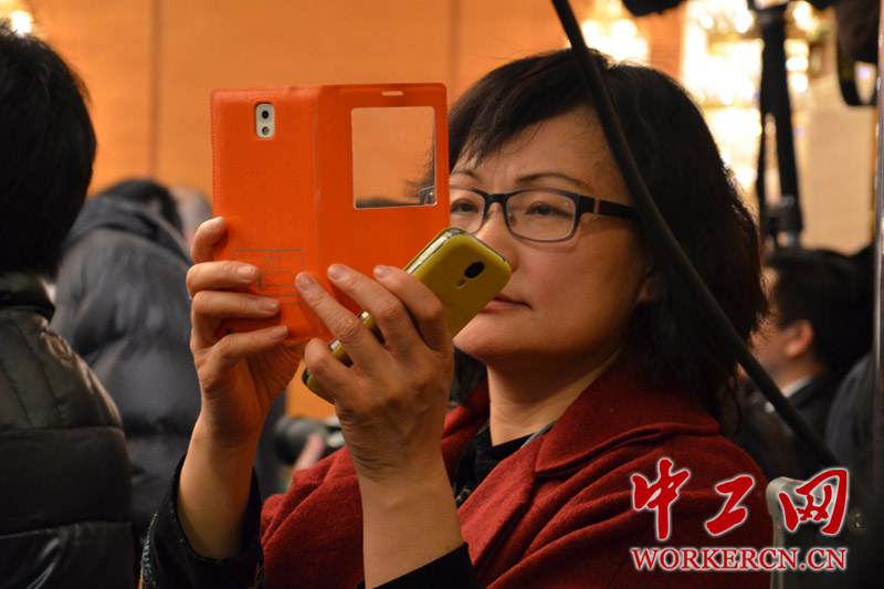 在全国政协十二届二次会议新闻发布会现场,一名记者正在使用多部智能手机进行图片报道。 (中工网记者 笑语摄)