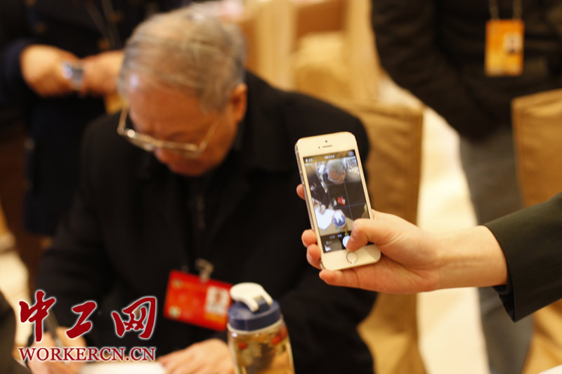 在北京会议中心,一名记者使用智能手机抓拍全国政协委员到会签到的画面。(中工网记者 笑语摄)