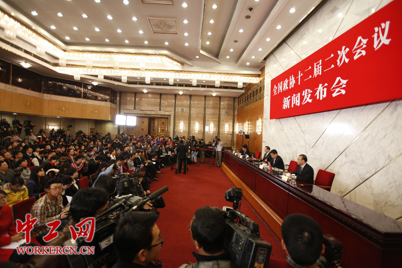 3月2日,全国政协十二届二次会议新闻发布会在人民大会堂新闻发布厅举行。大会新闻发言人吕新华 向中外媒体介绍本次大会有关情况并回答记者提问。图为发布会现场。 中工网记者 韩靖摄