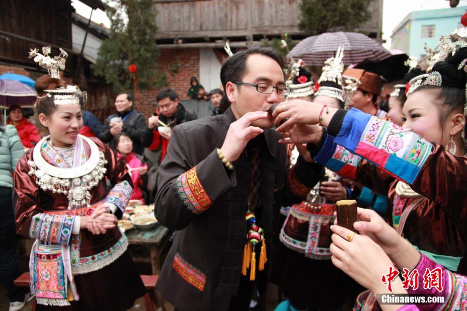 3月2日,是农历二月二,地处湘黔贵三省交界的广西三江侗族自治县梅林乡举办“二月二”侗族大歌节。图为侗族姑娘以传统的方式给宾客敬酒。黄国良 摄