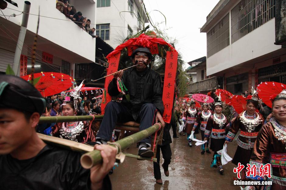 3月2日,是农历二月二,地处湘黔贵三省交界的广西三江侗族自治县梅林乡举办“二月二”侗族大歌节。图为节日中的游行队伍,都以侗乡传统民俗为题材。黄国良 摄