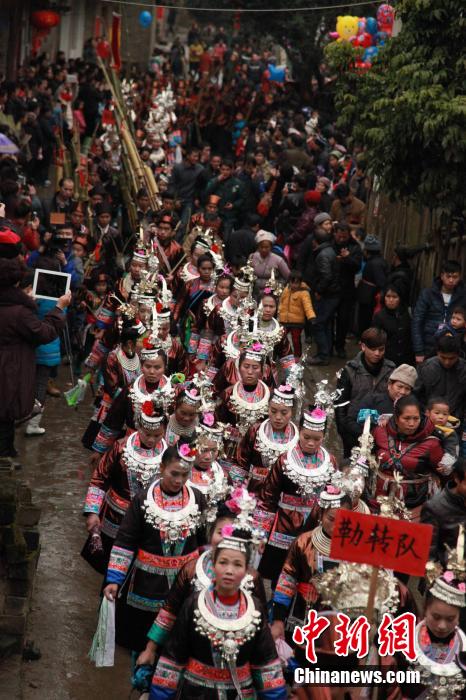 3月2日,是农历二月二,地处湘黔贵三省交界的广西三江侗族自治县梅林乡举办“二月二”侗族大歌节。图为游行队伍在乡镇中穿街而过,吸引大量居民围观。黄国良 摄