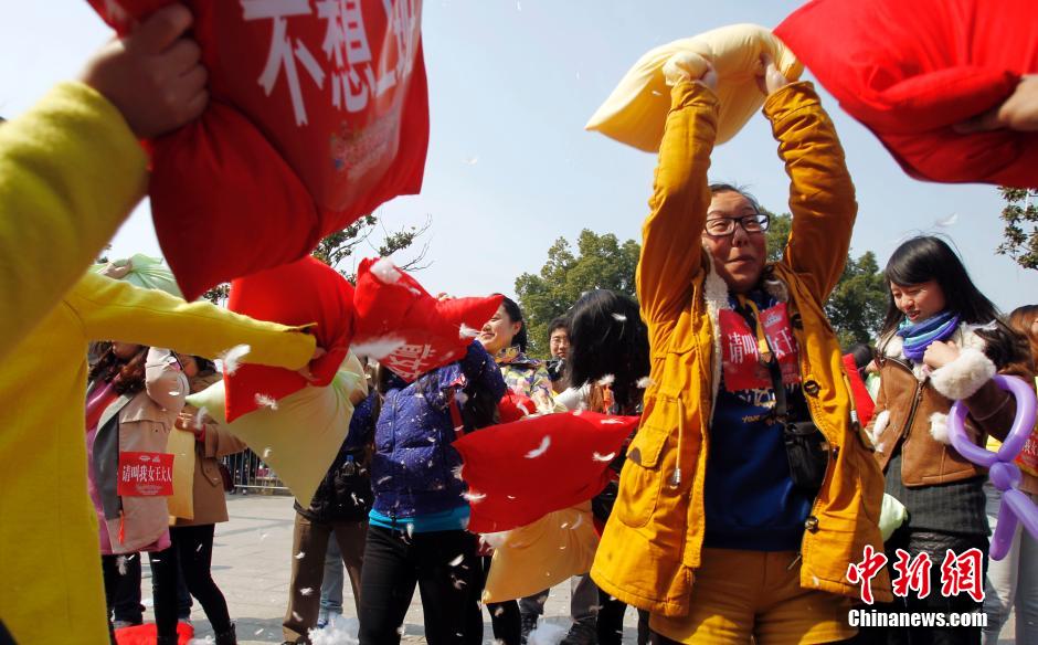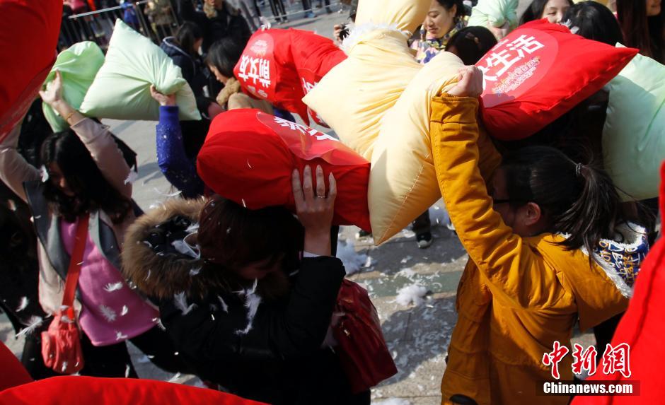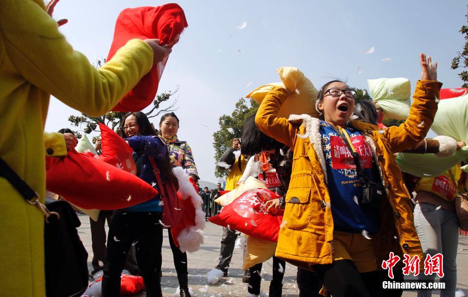 3月2日,上海欢乐谷上演“枕头大战”。不少都市女性抡起枕头通过“参战”宣泄压力和烦恼。中新社发 汤彦俊 摄