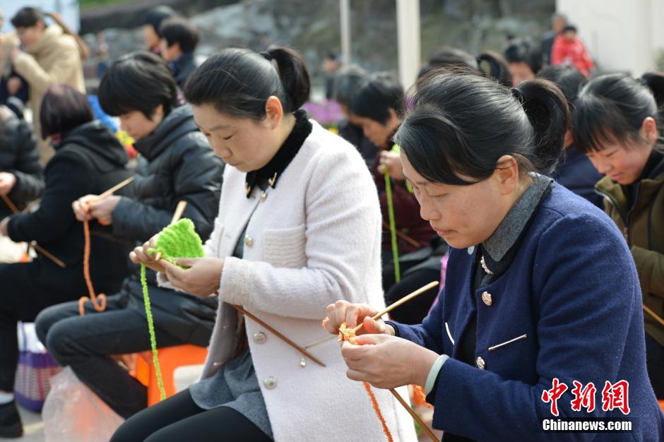 3月2日,浙江台州三门县50余名妇女参加围巾编制比赛。参赛者织好的充满温馨的“妈妈牌”围巾,将全部送给当地偏远山区的留守儿童。中新社发 陈维连 摄