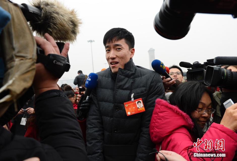 3月3日15时,中国人民政治协商会议第十二届全国委员会第二次会议在人民大会堂开幕。记者追访正在步入会场的刘翔委员。中新社发 刘震 摄