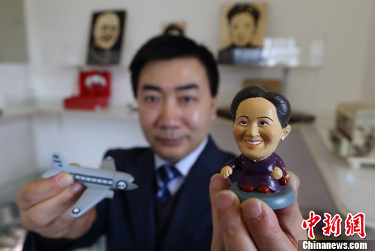 3月4日,《画家蒋宋美龄专题展》亮相南京美龄宫。图为工作人员展示来自台湾的文创产品“宋美龄公仔”。中新社发 泱波 摄