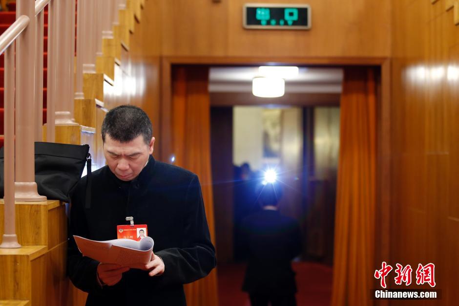3月5日,第十二届全国人民代表大会第二次会议在北京人民大会堂开幕。全国政协委员冯小刚在会场过道阅读政府工作报告。中新社发 盛佳鹏 摄