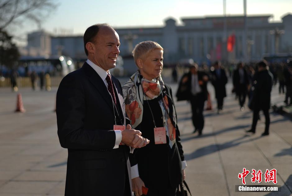 3月5日,第十二届全国人民代表大会第二次会议在北京人民大会堂开幕。旁听会议的荷兰使节一早就到达会场外。中新社发 廖攀 摄