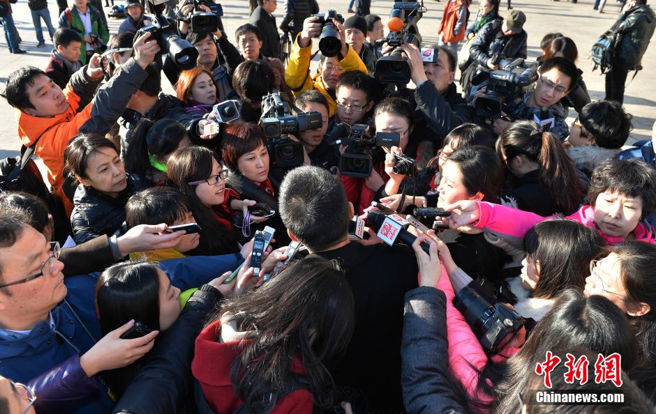 3月5日,第十二届全国人民代表大会第二次会议在北京人民大会堂开幕。海内外媒体记者聚集在人民大会堂外采访,新闻大战达到高潮。中新社发 骆云飞 摄