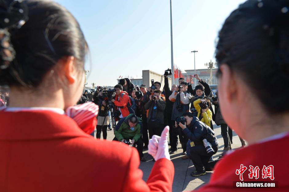3月5日,第十二届全国人民代表大会第二次会议在北京人民大会堂开幕。大会礼仪小姐成为众多媒体记者拍摄热点。中新社发 骆云飞 摄