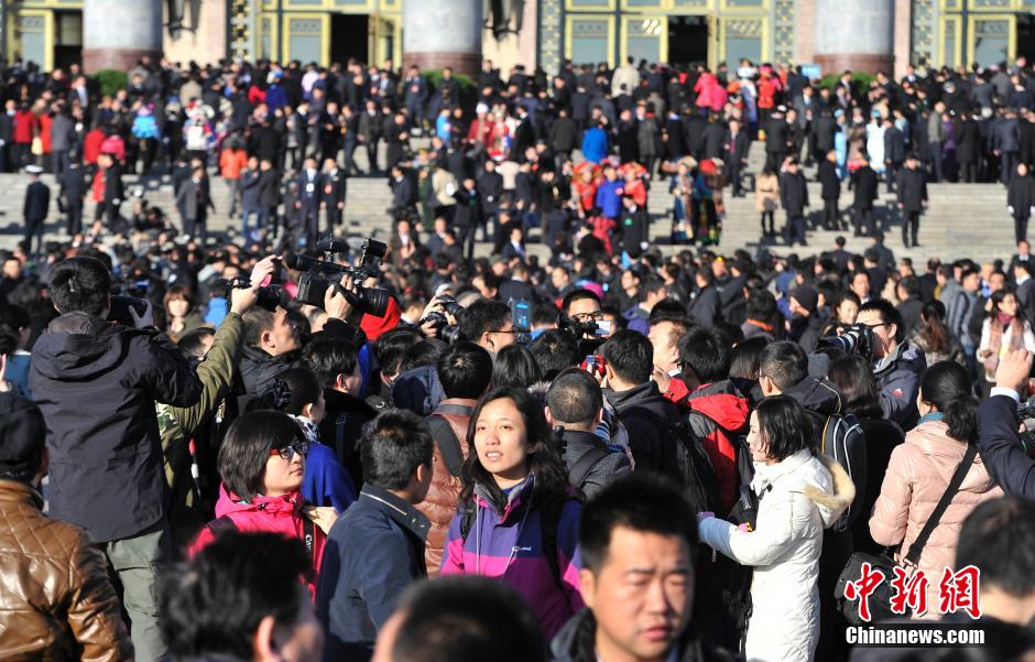 3月5日上午9时,第十二届全国人民代表大会第二次会议在北京人民大会堂开幕。海内外媒体记者聚集在人民大会堂采访,上演新闻大战。中新社发 骆云飞 摄