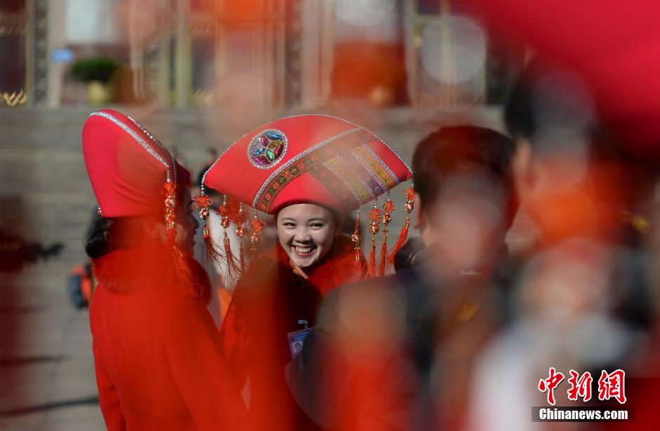 3月5日,第十二届全国人民代表大会第二次会议在北京人民大会堂开幕。大会服务员在北京人民大会堂东门外成为一道靓丽风景线。中新社发 廖攀 摄