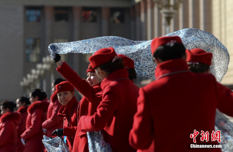 3月5日,第十二届全国人民代表大会第二次会议在北京人民大会堂开幕。大会服务员在北京人民大会堂东门外成为一道靓丽风景线。中新社发 廖攀 摄