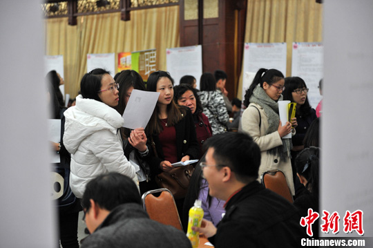 3月5日,参加福建省福州市第六届女性创业就业专场招聘会的大中专毕业生在了解岗位信息。当日,福州市女招聘会共有两场,150家单位将提供2500多个面向女性的就业岗位。中新社发 吕明 摄